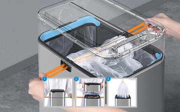 Çöp poşetini elleriniz kirlenmeden kolayca çıkarabilirsiniz. 1. İpi her iki tarafa doğru çekin, 2. Büzmeden sonra kapağı çıkarın, 3. Çöp torbasını çıkarın